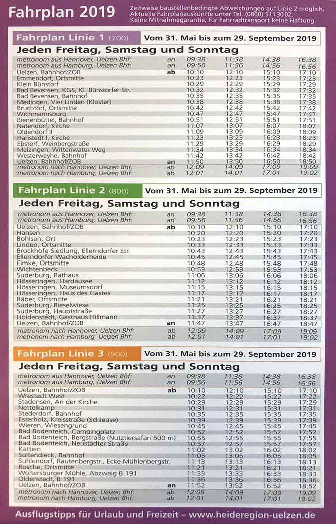 Knotenpunkt der drei Linien ist der Busbahnhof am Hundertwasser-Bahnhof Uelzen. Gäste, die mit dem Zug in die Hansestadt-Uelzen reisen, haben dort Anschluss an den Entdeckerbus. Die Abfahrten des Ausflugsbusses sind dem Bahn-Fahrplan des Metronoms nach Hamburg und Hannover angepasst.